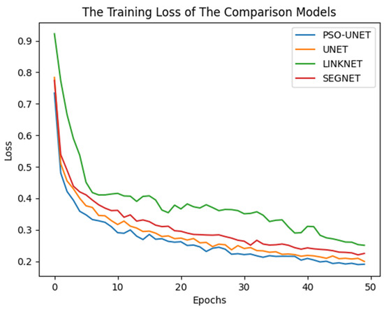 In Figure 10, the learning curve of the PSO-UNET model always stays in the bottom with others and shows the convergence smoothly in the training phase. This means our proposed model have the best learning strategy compared to others.