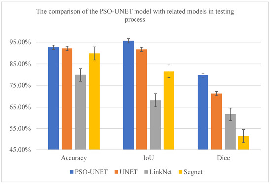 As shown in Table 6, our proposed model acquires the highest values in Acc, IoU and F1 score in the testing process. Accuracy of PSO-UNET reaches the peak of 92.64% over other models much higher than that of LINKNET (12.82% higher). IoU of PSO-UNET is a bit higher than that of UNET (about 4% higher) and very much higher than that of LINKNET (27.47% higher) and SEGNET (14.05% higher). However, the value of F1 score obtained by applying PSO-NET is a significantly higher than UNET (8.59%), much higher than SEGNET (18.17%) and very much higher than LINKNET (28.29%). Standard Deviation (S.D) of Acc and IoU computations of all models are very small (0.1%–3%) except F1 score computations of all models. The values fluctuate between 5% to 7% which is much higher when compared to Acc and IoU measure. In order to visualize the quantitative comparison obviously, we put these results of Table 6 in Figure 11.