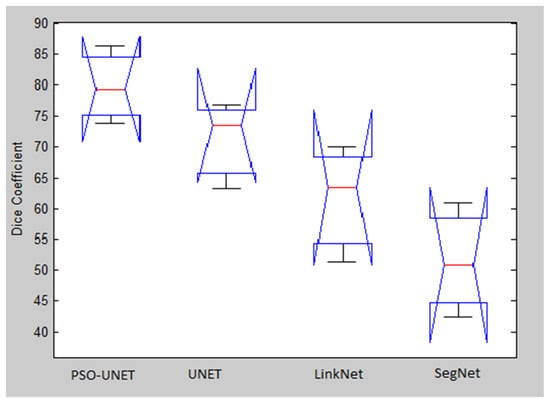 Since the interquartile range of the PSO-UNET model is smallest (less than 10%) compared to other models (greater than 10%), this means that the variability of the F1 score in three scenarios are not different and falls into the lowest quartile range. The whiskers of the PSO-UNET and PSO models are also small relatively compared to others (approximately 2%). Finally, the confidence interval of our proposed model is fluctuated in the smaller range (about 16%) and stay in almost higher percentage which means the results of F1 score in all cases are not different and the PSO-UNET model have a significant improvement.