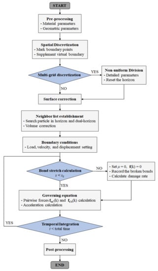 Figure 3 shows the program flowchart of the DH-PD model, which contains the pre-processing module, particle generation module, boundary treatment module, and damage degree calculation module. The C++ programming language is used to write the program code in this study.