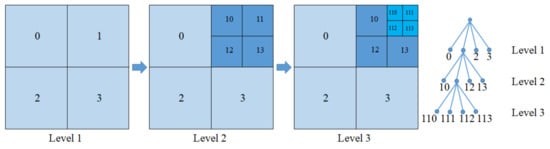 The discretization is carried out layer by layer. First, the domain is discretized into a series of coarse particles with the same spacing. Then, the second-level discretization is carried out in the area with high stress concentration. The coordinates of the second-level particles can be determined based on their geometric relationship with the first-level particles. For example, a two-dimensional plane consists of four particles (P0, P1, P2, P3) with a volume of V and a spacing of Δx, as shown in Figure 4. For the second-level discretization, a coarse particle (P1) with the coordinates (x1, y1) can be divided into four fine particles (P10, P11, P12, P13), with a volume of 0.25 V and a spacing of 0.5 Δx. Therefore, the coordinates of the fine particle P11 are (x1 + Δx/4, y1 + Δx/4). In the same way, the second-level particle (P11) can be divided into four third-level particles (P110, P111, P112, P113). The volume of the third-level particle is V/16, and the particle spacing is Δx/4. Based on this discretization, the coordinates of these finer particles can be easily determined by their geometrical relationships.
