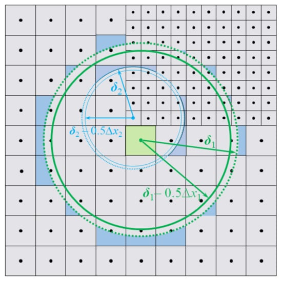 In PD theory, the problem domain is discretized into a series of particles, and each particle interacts with the neighboring particles in its horizon. However, some particles are located on the boundary and are not completely included in the horizon, as shown in Figure 5. Therefore, the model requires corrections with regards to the volumes of these particles when calculating the pairwise forces. For the multilevel discretization in DH-PD, the horizons of different particles vary with particle size, the particle volume can be corrected as: