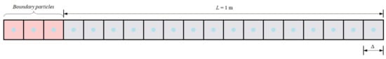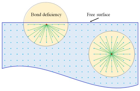 For the particles near the boundary of the problem domain, the number of neighboring particles in the horizon is lower than other particles, as shown in Figure 6. Therefore, the stiffness of the particles near the boundary is falsely reduced [41]. To deal with this problem, Scabbia et al. [42] presented an effective approach to mitigate the surface effect in state-based Peridynamics. Madenci and Oterkus [43] reconstructed the strain energy density near the boundary through the force density method and energy method to obtain the corresponding correction coefficients. The surface correction factor can be obtained by exerting a simple fictitious load to the object along the direction of the reference coordinate system. Based on this, the ratio of the strain energy densities calculated through the classical continuum mechanics theory and PD theory can be used as a valid surface correction factor.