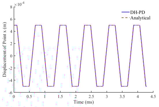 The bar is discretized into 1000 particles with a particle size of Δx = 0.001 m. Three fictitious boundary particles are fixed at the left side of the bar for the enforcement of displacement constraints. “No-fail zone” is commonly used for some applications under extreme loading conditions to avoid unexpected failure between the particles close to the external boundaries. For the loading conditions in the numerical examples presented in this paper, no-fail zone is not used. The computational time step is set as Δt = 0.2 μs, and the horizon associated with each particle is set as 3Δx. The particle with the initial position of x0 = 0.5 m is selected as the analysis object. Its displacement time history is compared with the analytical solution [44], as shown in Figure 8. The expected longitudinal vibration is successfully captured by the DH-PD model after the volume correction and surface correction. Overall, the numerical results are consistent with the analytical solution, thus verifying the accuracy of the presented DH-PD model.
