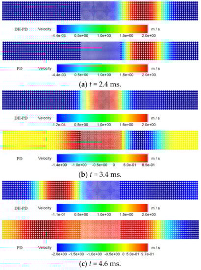 The numerical results of the velocity wave propagation through the dense zone are shown in Figure 12 (DH-PD above, PD below). When the time is 2.4 ms, the velocity waveform transmitted is about to enter the dense area. Figure 12a shows that both PD and DH-PD simulate this stage accurately. When the time is 3.4 ms, the velocity of the center point in the dense area reaches the theoretical maximum of 2 m/s when using the DH-PD algorithm. When the traditional PD algorithm is used, the phenomenon of false wave reflection to the right will be found, weakening the wave peak of the velocity waveform in the dense area (Figure 12b). This violates the wave propagation theory in the same material and cannot completely simulate the wave propagation process. When the time reaches 4.6 ms, the velocity wave leaves the dense area and enters the non-dense area (Figure 12c).