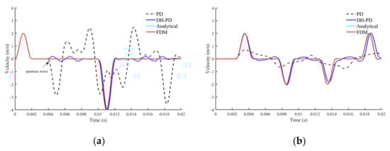 The material points at the free end of the plate and the middle-end of the plate are monitored and their velocity characteristics are extracted and shown in Figure 13. The FDM simulation curves are almost identical to the analytical solutions, both of which can be used as a reference group. The conventional PD simulation is used to show anomalous spurious reflected waves. At a time of 3.5 ms, the velocity in the dense region is less than 1 m/s, which is half of the real value, and the spurious velocity wave is also received at the free end. DH-PD can simulate the complete propagation process of the wave, and it matches both the analytical solution and the FDM solution.