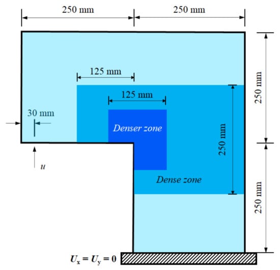 Figure 14 shows the geometry of an L-shaped concrete specimen [45,46]. A total of 22,728 particles with different particle sizes and varying horizons are used in this case. Specifically, 7504 finer particles (Δx = Δy = 1.25 mm) are used near the corner of the L-shaped specimen, where the stress is relatively concentrated, 4300 coarser particles (Δx = Δy = 5 mm) are distributed at the periphery of the specimen, and 10,924 particles of size Δx = Δy = 2.5 mm are distributed between finer particles and coarser particles. The horizon size is set as 3.015 times the particle spacing. The information of the particles is shown in Table 1 and Figure 14. The other physical parameters include the modulus of elasticity, E = 25.85 GPa, the Poisson’s ratio, ν = 0.18, the energy release rate, Gc = 65 J/m2, and the time increment, Δt = 0.1 μs. A displacement boundary, u, is exerted at the left side of the specimen, as shown in Figure 14.