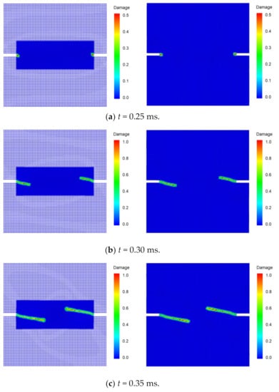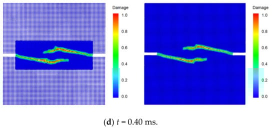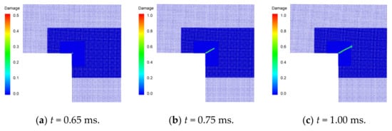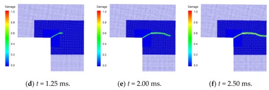 Figure 15 shows the simulated crack propagation in the L-shaped plate. At t = 0.65 ms, a crack appears at the corner point of the L-shaped plate and propagates in the direction of 26° on the horizontal. Then, the direction of crack propagation changes to horizontal at a time close to t = 1 ms. The transverse crack expands to the right boundary of the specimen and cuts across the plate when t = 2.5 ms.