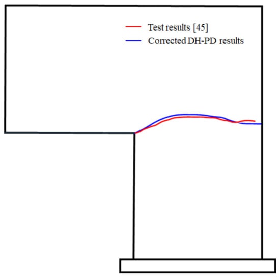 To quantitatively compare the numerical and experimental results, the load-displacement curves are obtained based on the numerical results, and are compared with the experimental data in Figure 17. The comparison shows that the varying tendencies of the simulated curves match the experimental data well, and the calculated peak values of the load are close to the test value, thus verifying the validity and applicability of the presented model. In addition, the figure also shows that the corrected DH-PD model has a relatively higher simulation accuracy than DH-PD model.