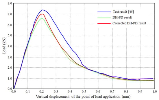 In the simulation of the fracture of an L-shaped concrete specimen, the specimen was discretized into particles with three different sizes and varying horizons. The simulated crack propagation produced a crack path consistent with the experimental results. Based on the Pearson correlation coefficient for quantitatively comparing the results, the coefficient value of 0.988 verified the calculation accuracy of the presented DH-PD model.
