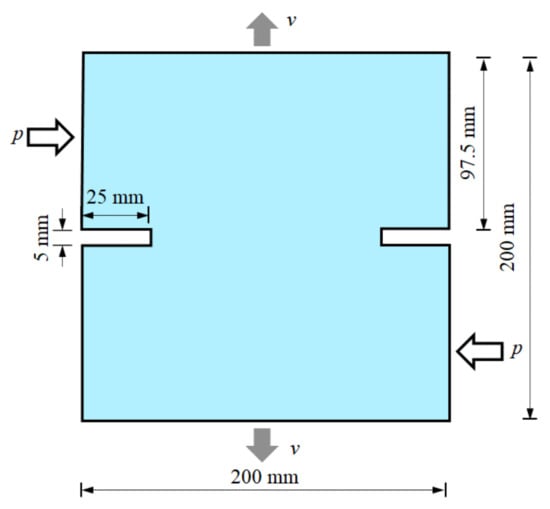 Figure 18 shows a square thin plate with a length of 200 mm on each side, an elastic modulus of E = 30 GPa, a density of ρ = 2265 kg/m3, a Poisson’s ratio of ν = 0.33, and energy release rates of GIc = 110 J/m2 and GIIc = 1100 J/m2. There is a prefabricated crack 25 mm in length and 5 mm in width on both sides of the specimen [46,47]. A uniform load, p, with a resultant force of 5 kN is applied in the horizontal direction on the left upper half and the right lower part of the plate. Meanwhile, a velocity load, v = 10 mm/s, is applied at the upper and lower boundaries of the plate, as shown in Figure 18.
