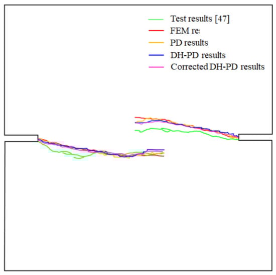 Figure 20 compares the simulated crack paths with experimental data obtained by Nooru-Mohamed et al. [47], those calculated by the FEM model proposed in [48], and the traditional PD model. All the simulated crack paths coincide with the experimental results. To quantitatively analyze the computational accuracy of the corrected DH-PD model, Table 4 lists the Pearson correlation coefficients of the numerical and experimental crack paths shown in Figure 20. The comparison demonstrates that the simulation results obtained by the corrected DH-PD model proposed in this study match the experimental results better than those obtained by other numerical models.