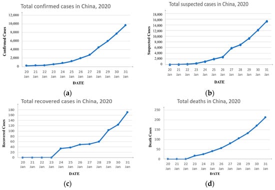 Official statistics. (a) The number of confirmed cases due to COVID-19 from 20 January to 31 January; (b) the number of suspected cases due to COVID-19 from 20 January to 31 January; (c) the number of recovered cases due to COVID-19 from 20 January to 31 January; (d) the number of deaths due to COVID-19 from 20 January to 31 January.