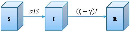 The SIR model was proposed by Kermack and Mckendick in 1927 []. In this paper, using the core ideas of the SIR model, the population under consideration is divided into three compartments: susceptible (), infective (), and removed (). The susceptible class () represents those individuals who can obtain the disease but are not yet infective. The infective class () refers to those who have been infected with the virus and are transmitting the disease to the susceptible class. The removed class () consists of those who are removed from the susceptible–infective interaction by recovery with immunity, or death.
