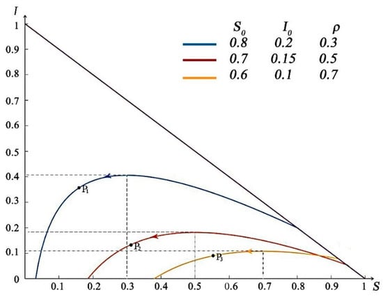 As shown in Figure 3, we define the initial susceptible population in the phase trajectory as and the number of infected people as . The arrows in the figure indicate the changing trends of and as time increases. With the variation in removal rate , the arrival time of the peak value of the curve is different. Additionally, when , it is the highest point of the curve, as shown in , , and points in Figure 3. With , as shown in Figure 3, the corresponding peaks of are . Considering , for instance, if the point of initial values falls on the left side of the vertical line , decreases monotonically to as . That is, the number of patients gradually decreases and disappears eventually. When the initial value of was on the right side of the line , with the increase in , the value of increases, and the number of patients with infectious diseases increases until the passes the point of , at which point begins to decrease gradually and towards to zero.