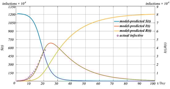 Current studies show that COVID-19 is a new pathogen, so people of all ages are immune to new coronavirus and are generally susceptible to infection []. For this pandemic, the official notification of the epicenter was the Huanan Seafood Market in Wuhan []. The local hospital reported the first unexplained pneumonia case on 8 December 2019, which was diagnosed as having been infected by a novel coronavirus. During the 40 days from 8 December 2019 to 19 January 2020, there was a giant flow of population in the market for the Lunar New Year, and these people were scattered in all regions of Wuhan, and the virus can infect all kinds of people. Therefore, we set the population of Wuhan as the initial susceptible population, that is, the value of S (0) is 12.3 million. We define the susceptible population of the initial state nationwide as the number of people with initial diagnosis nationwide as , and the number of rehabilitation and death cases in the initial state nationwide as Taking 20 January 2020 as the initial state nationwide, there is , , .