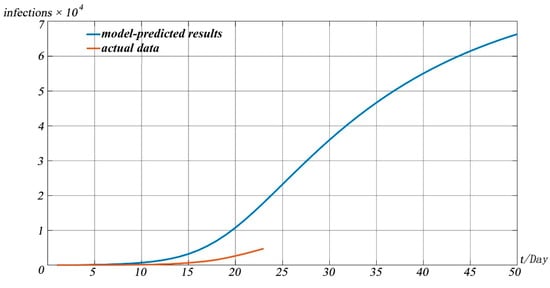 Figure 7 shows the pandemic situation in Wuhan predicted by the model 50 days after 20 January 2020, and compares it with the real situation. In order to verify the difference between the model simulation results and the real situation, we simulated the number of confirmed cases in the whole process of the pandemic and compared them with the real situation of the pandemic. It can be seen from Figure 7 that the model is close to the real situation of the pandemic to a large extent, indicating the effectiveness of the model for pandemic prediction.
