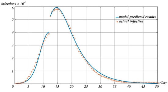 Let Equation (7) be equal to zero, and then the LSE of the parameters , and can be obtained by Matlab. In this paper, the collected pandemic data are substituted into Equation (7) for simulation verification. The simulation results can be seen in Section 3.