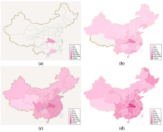 Since Wuhan is a transportation hub in central China, many provinces have a history of travel to Wuhan apparent in their imported cases. Therefore, we collected the nationwide number of confirmed cases from 20 January 2020 to 9 February 2020 [], and drew the heat maps with an interval of five days as shown in Figure 8.