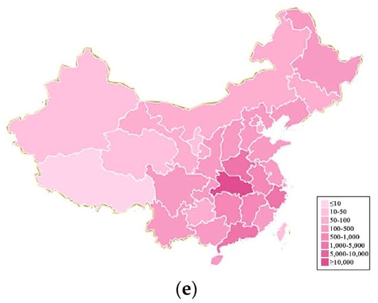 As can be seen from Figure 8a–e, Hubei Province serves as the epicenter. The pandemic gradually spread to neighboring provinces over time. The number of confirmed cases is the highest in Hubei province and in neighboring provinces.