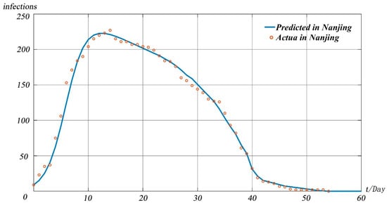 It can be seen from Figure 10 that under the existing pandemic prevention and treatment measures in Nanjing, the pandemic peak will appear on 3 August 2021, and the peak number of infected people is about 223. We define Nanjing’s susceptible population as . Since the pandemic originated from a highly mobile and densely populated airport, increased significantly. It can be seen from Figure 10 that the prediction results of our model are close to the real data, indicating that the model in this paper can be equally applicable in small-scale pandemic situations.