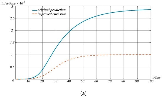 Figure 11a,b reflect the impact of drug research and development and treatment scheme improvement on the spread of the pandemic. With the introduction of measures such as drug research and development and improvement of treatment schemes, the cure rate of patients will be improved significantly and the death rate of diseases will be reduced greatly. We simulated the impact of drug research and development and the improvement of the treatment scheme on the pandemic situation by increasing the value of and reducing the value of . Simulation shows that the development of drugs and the improvement of treatment plan can lead to the peak of the pandemic in advance, and the number of infected people at the peak of the pandemic is lower than that without drugs and treatment measures.
