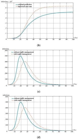 Figure 11c reflects the impact of the implementation of traffic restriction measures in Wuhan based on pandemic prevention and control. The introduction of traffic restriction measures in many cities led by Wuhan City, Hubei Province can reduce vulnerable people to a certain extent. We assessed the impact of traffic restriction measures on the overall pandemic situation by reducing the value of . It can be found that the overall impact of the scheme on the pandemic situation is limited. That is, although the peak of the pandemic situation will decrease and move back to a certain extent, the degree of reduction of the peak is small, only about 100 people, and the time of the peak moving back is about 6 days.