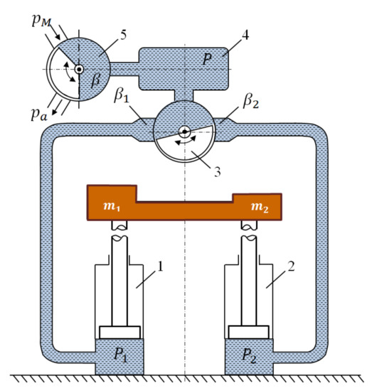 The object of research in this work is a rather complex manipulator designed to lift a heavy, bulky load using two parallel and synchronously operating hydraulic actuators 1 and 2 (Figure 1). Let us describe the mathematical model of the object. The moving object has a mass , where are the mass loads applied to the actuators. The main working cavities are the lower cavities of the actuators; however, if necessary, the upper cavities can also be used (for example, when lowering an object). The law of motion is mainly determined by the pressures in the lower cavities, which are connected through the control valve 3, the intermediate cavity 4 (volume V) and the control valve 5 when the object is lifted to the power source (with pressure ), and when the object is lowered, to the drain line (with pressure , usually equal to atmospheric). The ratios between the effective flow area of the valve 5 and the effective flow areas of the valve channels 3 leading to the cavities of the actuators are established depending on the formulation of the problem.