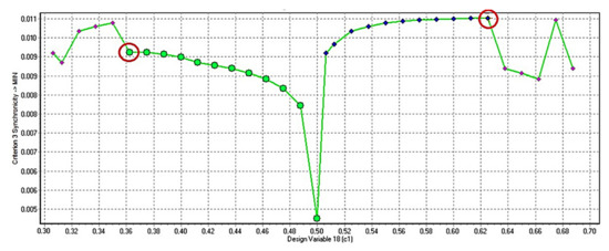 With an increase in the load imbalance, the synchronization of the actuators monotonically deteriorates, and asymmetrically when c1 deviates from 0.5 to the lower or higher side. However, starting from certain values of , this dependence is violated, and the graph begins to behave unpredictably. In Figure 2 these points are circled in red. Solutions outside these values will be considered unacceptable. To detect such cases, for each checked value of , we will perform several additional calculations with the load up to 0.5.