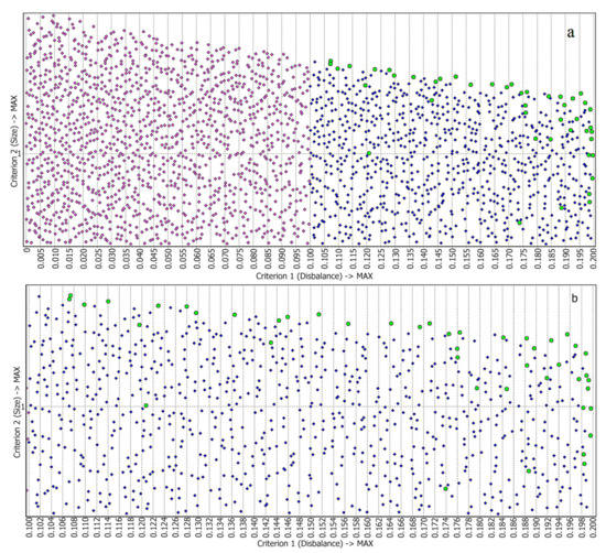 The set of solutions in the space of criteria: (a) and ; (b) and on a larger scale. Blue dots denote feasible solutions, crimson dots—infeasible ones due to the constraint , green circles—Pareto optimal solutions.