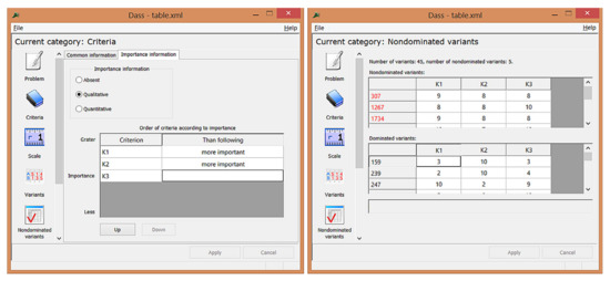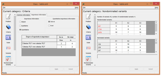 At the next step of solving the choice problem by the criteria importance method, we enter information about the ordering of criteria by importance into the software DASS, as shown in Figure 5 [27,29]. The criterion is more important than the criterion , and the criterion , in turn, is more important than the criterion .