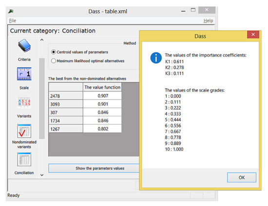 The resulting 4 vector scores remain incomparable with the introduced information about the DM’s preferences. Next, we will analyze them from different angles. At this stage, the value functions of these vector scores can be estimated by calculating the centroid values of the decision maker’s preference parameters [28]. Figure 6 shows how to do this in the software DASS, Table 4 shows the resulting values of the value functions.