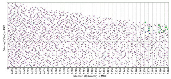 The first practical conclusion based on the analysis of Figure 3 is the following: a lot of feasible solutions are obtained with an acceptable value of the load imbalance . Therefore, we can safely discard some of the solutions with weakly acceptable values of , imposing an additional constraint on the feasibility of the solution , and this leaves quite a lot of feasible solutions—821. Of these, 45 are Pareto optimal solutions. The values of the criteria for these 45 options are shown below in Table 2. The result of imposing this restriction in the criteria space is shown in Figure 4.