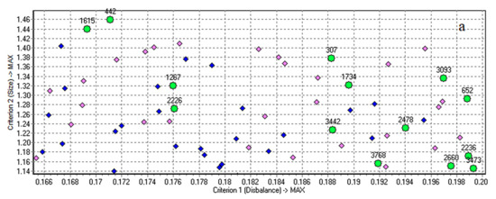 In the software MOVI, 4000 alternative solutions were generated, the coordinates of which are uniformly distributed in the space of variable parameters [20,21]. Of these solutions, 2198 were found to be feasible in relation to the constraints of the model. Among the feasible solutions, there were 96 Pareto optimal solutions. Each solution x can be associated with a three-dimensional vector , the components of which are estimates by three criteria. If the solutions are depicted as points in the three-dimensional space of criteria, then they form a cloud in a certain area, and the points of Pareto optimal solutions will be located on a part of the boundary of this cloud. In Figure 3 is shown how the projections of the cloud from the points of feasible solutions to the two-dimensional spaces of criteria are distributed. Blue rhombuses denote admissible solutions, green circles-Pareto optimal ones.