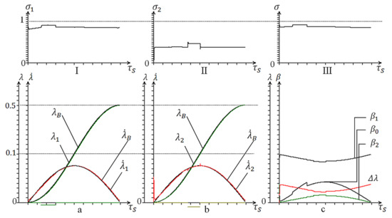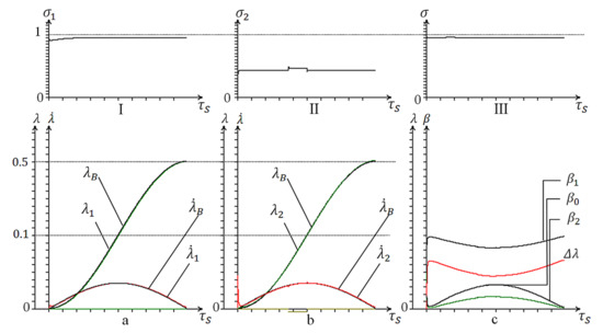 - channel opening curves (, , ): changes in the mismatch criterion in the movement of actuators, III—pressure in the intermediate cavity ().