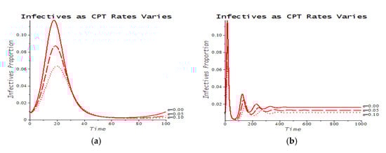 Graphs showing the effects of different rates of CPT on decreasing the number of infectives (i.e., lowering the height of the infective peaks) (a,b) and, consequently, increasing the number of remaining susceptibles (c,d). The other parameters were the same as in Figure 2.