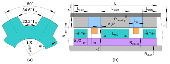 Geometric parameters of the SHM: (a) rotor radial dimensions; (b) stator and rotor axial and radial dimensions.