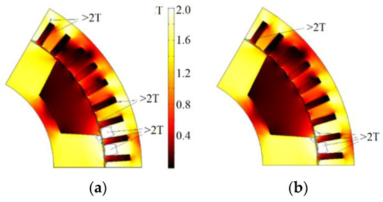 The motor cross-section and the magnitude plot of flux density; black outlines mark the extreme saturation level (>2 T): (a) before optimization; (b) after optimization; it can be observed that after optimization, the area of regions with flux density >2 T noticeably decreased.