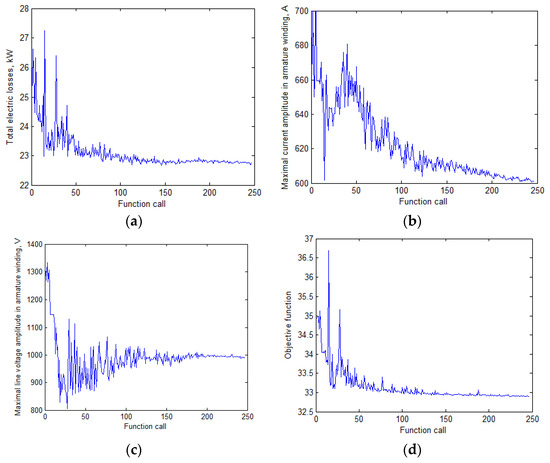 Variations in the objectives during the optimization: (a) total losses <Plosses>; (b) maximum current amplitude in the armature winding; (c) maximum voltage amplitude in the armature winding; (d) objective function F.