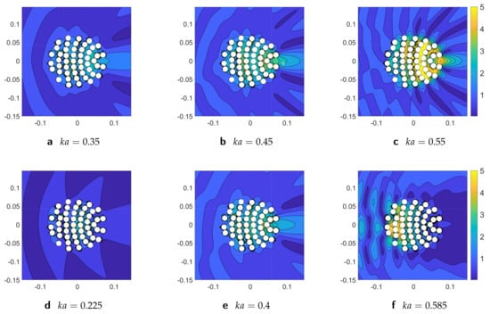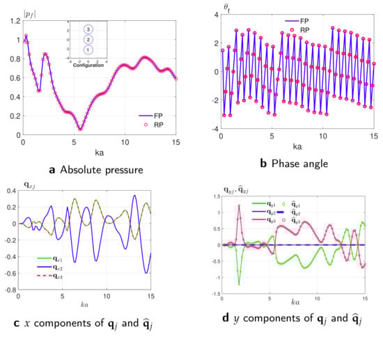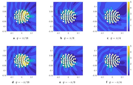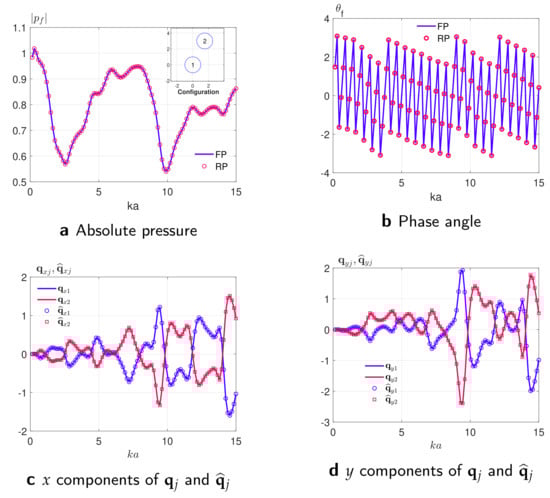 where is the Hankel function of the first kind of order n, denotes the argument of vector , i.e., the angle that the vector makes with the positive x-axis, and it is measured as and [38]. Introducing Equations (3) and (6) into Equation (2), and evaluating it at the focal point , defines the total pressure at the fixed focal point: