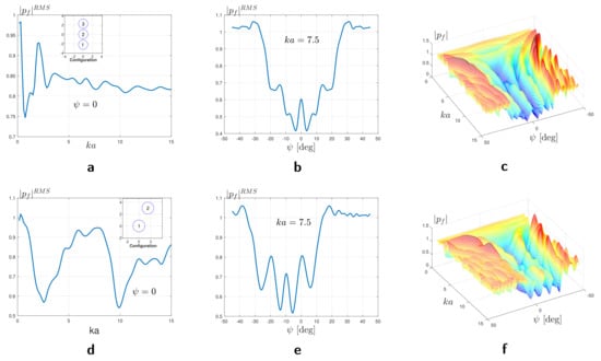 Absolute pressure at a focal point, i.e., , with respect to normalized wavenumber and angle of incidence for configurations that are symmetric (a–c) and non–symmetric (d–f) with respect to the x and y axes.