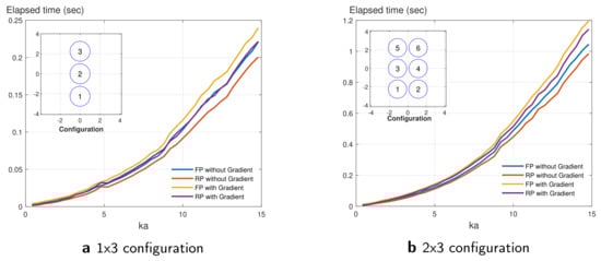 In order to compare between the CPU time of the two computing methods, two configurations were used as depicted in Figure 6a,b. Figure 6 shows the measured time. The elapsed times were used in computing the absolute pressure only, and the absolute pressure and the gradients sequentially varying the wavenumber and using both the FP and the RP methods were measured. This was done at different discrete values of . It can be seen from Figure 6 that the computation time generally increases for all computations as the non-dimensional frequency increases. Furthermore, generally the computation time in the configuration with higher number of cylinders is higher. This is due to the increase in the rank of the matrices to be evaluated during the computation process. In addition, the computation time increases for both FP and RP formulations when gradients are evaluated. However, providing gradients improves the performance of GBO algorithms allowing the faster convergence and more accurate and more reliable computations [33]. For configuration, FP with gradients takes the most compute time and FP without gradients is the least computation time; the compute times of RP with gradients and FP without gradients are of similar order. For configuration, the computation times of different methods can be put in a descending order as follows: FP with gradients, RP with gradients, FP without gradients, and RP without gradients. This depicts that using the RP method is computationally less expensive than the FP method.
