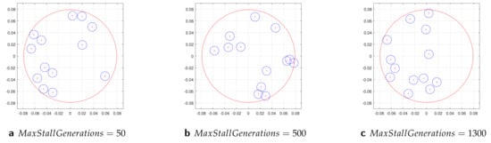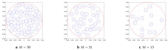 Initial random configurations of cylinders in a circular region considered in numerical simulations. Positions of each scatterer are included as components of feasible initial design vector in GBO. The focal point is located at . The radius of each cylinder denoted by blue color is m. The radius of artificial red circle is m, where m is defined by constraint Equation (52). This circular region defines the location of acoustic lens comprised of a uniform planar configuration of cylinders constrained to stay within this region.