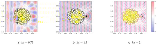 In order to apply the solution Equation (9) in practice, the infinite sum must be truncate. Let N be the truncation value of the infinite sum in Equation (9) chosen so that the sum converges. In practice, the value of N depends upon frequency and typically taking the truncation number ka is adequate [29]. Let us introduce the vectors . The components of the scattering coefficient vector , , , are found from Equations (A21) and (A22), and written in column vector form: