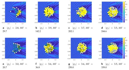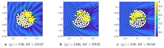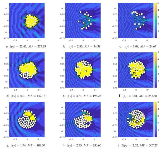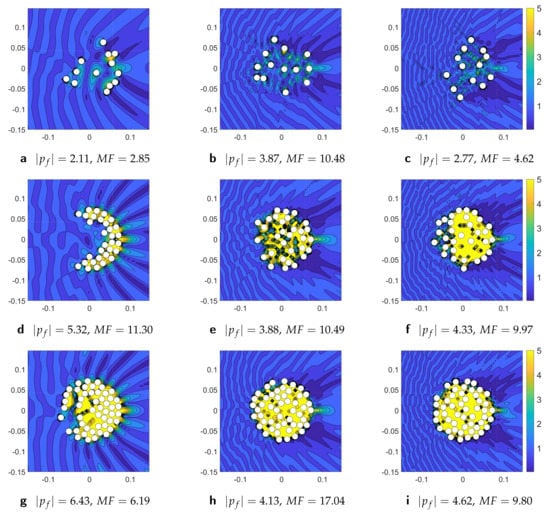 The sound localization was implemented by maximizing the absolute pressure at the focal point and by employing a gradient based optimization. Computations are performed on MATLAB using advanced parallel optimization algorithms, the MultiStart optimization solver combined with fmincon solver and SQP algorithms, and supplying the gradients of absolute pressure amplitude at the focal point . Figure 7 illustrates initial random configurations of cylinders used in simulation where the locations of the control cylinder positions are denoted by pink dots. For given scatterer location points, the gradients are in the direction of greatest increase of absolute pressure amplitude at the focal point . As seen in the example of Figure 3 and Figure 4, this provides the optimal directions to increase by incremental displacement. Thus, in order to maximize the produced by acoustic lens, we will move the cylinders inside the circular region in the direction of the gradient vectors, i.e., using gradients evaluated by FP and RP formulations. This is achieved in MATLAB with the use of Global Optimization and Parallel Computing Toolboxes, and by supplying the derived analytic form of the gradients vectors from Equation (34).