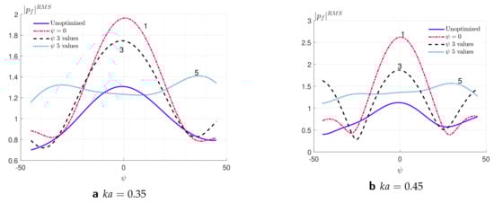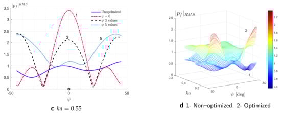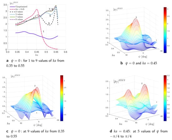 Figure 17 presents , as a function of incidence angle and the normalized wavenumber considering a simultaneous multi-frequency and multi-angle optimization of at a broad range of the incidence angle and 3 values of wavenumber for configurations of rigid cylinders. Figure 17a–c displays the variation of with the angle of incidence at three fixed values of wavenumber (a), (b), and (c) for the optimized and initial unoptimized configurations cylinders. Figure 17d illustrates the 3D surface plot of versus and simultaneously. Here, the lower blue mesh denoted by “1” represents the results for a non-optimized configuration and the higher mesh indicated by “2” exhibits the results for the configuration optimized at three values of wavenumbers and five incident angles. Figure 17d shows that the non-optimized surface mesh “1” depicts the low values of in all considered values of and , and the surface mesh “2” is slightly lifted up with its highest amplification around and at the largest values of considered, i.e., . As can be seen from these figures, optimizing for angle of incidence using five equidistant values of , the overall show low values in the incidence range considered which suggests that this range is too ambitious for the small number of discrete incident angles and frequencies considered. Therefore, we narrow it down to .