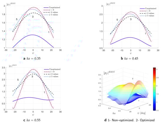 The RMS of pressure at focal point, , optimized at 3 values of and 5 equidistant values of for the optimized configurations of rigid cylinders. In (d), “1” denotes the results for a non–optimized configuration and “2” represents the results for the optimized configuration.