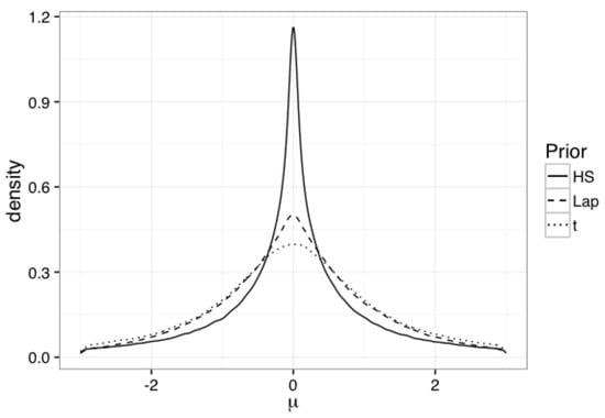 Densities of the implied prior on based on the horseshoe prior, the t prior, and the Laplacian prior.
