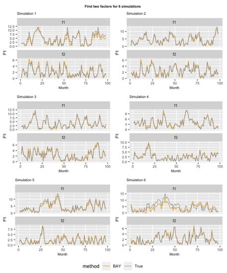 We then investigate whether the BAY method can accurately estimate the latent factors . In our approach, latent variables are also estimated with posterior means, i.e., , , and is the number of MCMC iterations after the burn-in period. Figure 5 plots the estimated first two latent factors from BAY approach, together with the true latent factors, in the first 100 months (in-sample period) of the data for six simulations. The absolute values are compared since the factors are identified up to a change of sign (Section 2.1). Figure 5 shows that, generally, the estimation from the BAY approach is close to the true factors, especially for the first four simulations in which the true number of contributing latent factors is successfully detected.