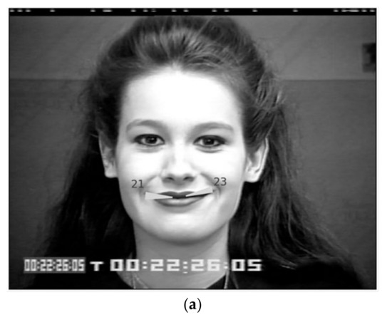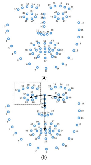The human face conveys a lot of potentially useful information. For feature extraction, in a data preprocessing step, established software was used, namely OpenFace library [33], which receives a 2-dimensional image, i.e., a camera frame as an input and outputs the 2-dimensional coordinates of 68 facial landmarks (points) on the contours of the brows, eyes, nose, mouth, and jaw, as shown in Figure 2a.
